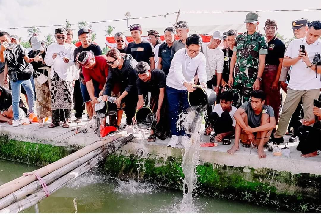 Sekda Adi Arnawa didampingi anggota DPRD Kabupaten Badung Ni Putu Yunita Oktarini melakukan penebaran ikan secara simbolis sebagai tanda telah dibukanya lomba mancing.