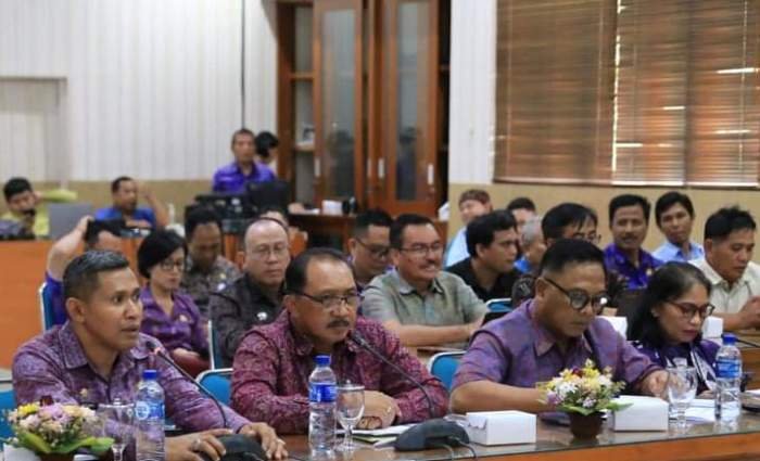 Pj Bupati Klungkung I Nyoman Jendrika memaparkan profil, pencapaian dan pertumbuhan ekonomi Kabupaten Klungkung di hadapan para panelis di ruang rapat Praja Mandala Kantor Bupati Klungkung.