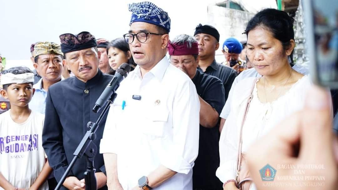 Bali Terkini – Penjabat (Pj) Bupati Klungkung, I Nyoman Jendrika dampingi Menteri Perhubungan Republik Indonesia, Budi Karya Sumadi melayat ke kediaman almarhum Putu Satria Ananta Rustika (19) di Dusun Bandung, Desa Gunaksa, Kecamatan Dawan Kabupaten Klungkung, Kamis (9/5). Almarhum meninggal dunia akibat kekerasan oleh seniornya di Kampus Sekolah Tinggi Ilmu Pelayaran (STIP) Jakarta pada Jumat (3/5) lalu.