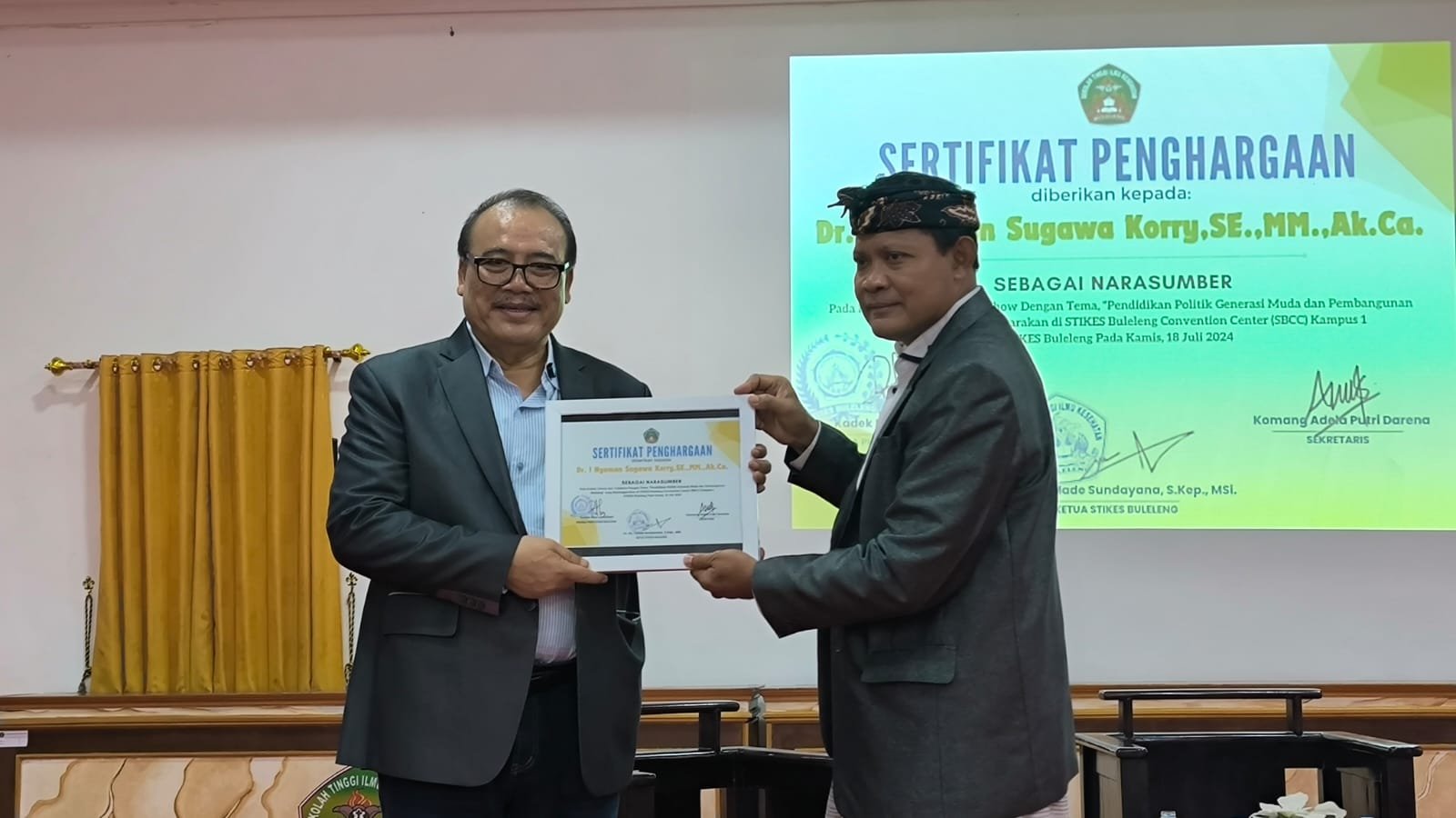 Bali Terkini – Bakal Calon Bupati dari Partai Golkar sekaligus Ketua DPD Partai Golkar Bali, Nyoman Sugawa Korry meminang Ketua STIKES Buleleng, Made Sundayana untuk menjadi wakilnya dalam perhelatan Pemilukada tanggal 27 November mendatang. Politisi Asal Desa Banyuatis ini meminang Sundayana ketika acara Pendidikan Politik yang dilaksanakan di Kampus STIKES Buleleng Kampus Bungkulan, Kamis (18/7).