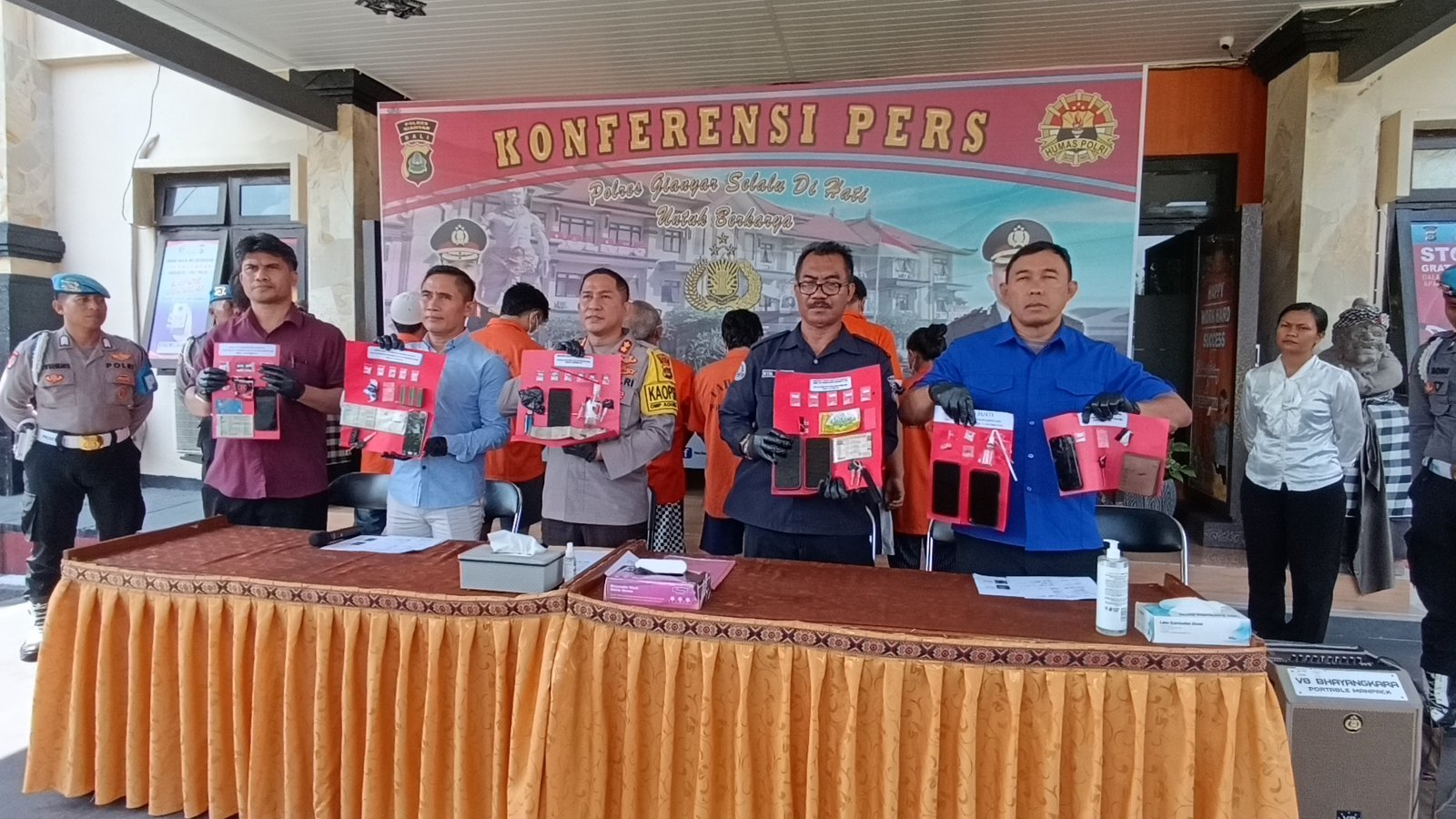 Tersangka yang ditangkap ialah Luluk Amsiana Dwi Kemerdian (40/residivis), Dedi Tri Santoro (34/residivis), Nur Hadiyono (42), Lando Revando (32), Fatria Rohmawati (25), Komang Tony Triyana (26/residivis), Anak Agung Rai Pong (38), dan Wayan Sumertha (52).