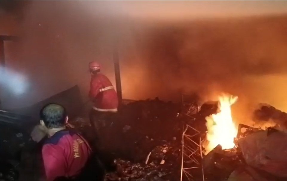 Api yang berkobar cepat menghanguskan seluruh isi gudang, menyebabkan seorang pria yang belum teridentifikasi tewas dalam kondisi terbakar.