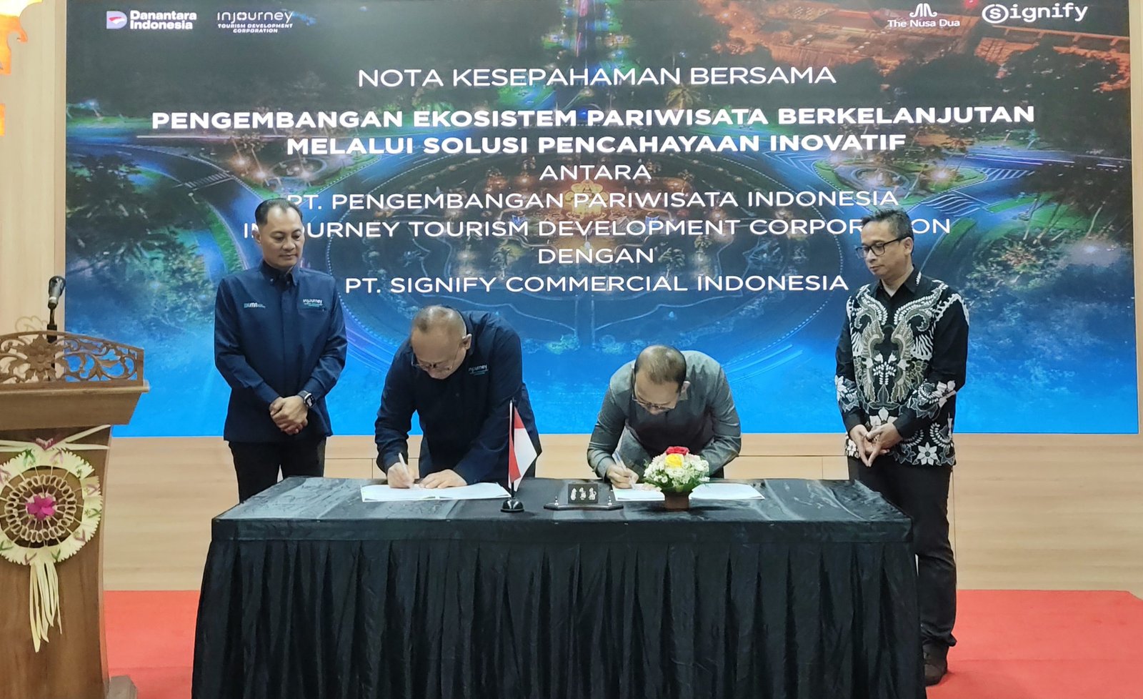 Untuk itu, ITDC dengan PT Signify Commercial Indonesia, pemimpin global di bidang teknologi pencahayaan, melalui penandatanganan Nota Kesepahaman Bersama (MoU) untuk pengembangan ekosistem pariwisata berkelanjutan berbasis teknologi pencahayaan inovatif dan efisien energi. Penandatanganan MoU dilakukan oleh Direktur Operasi ITDC, Troy Warokka, dan Direktur PT Signify Commercial Indonesia, Lucas Ardhana, bertempat di Wantilan ITDC, The Nusa Dua, pada hari ini Sabtu (25/10).